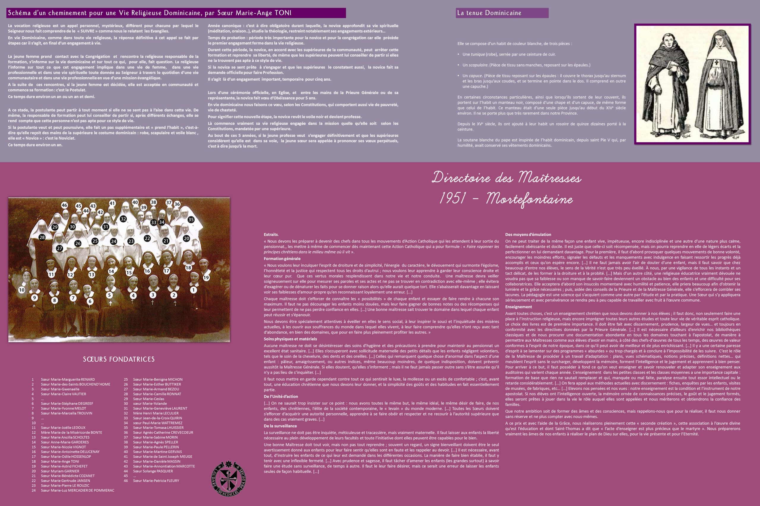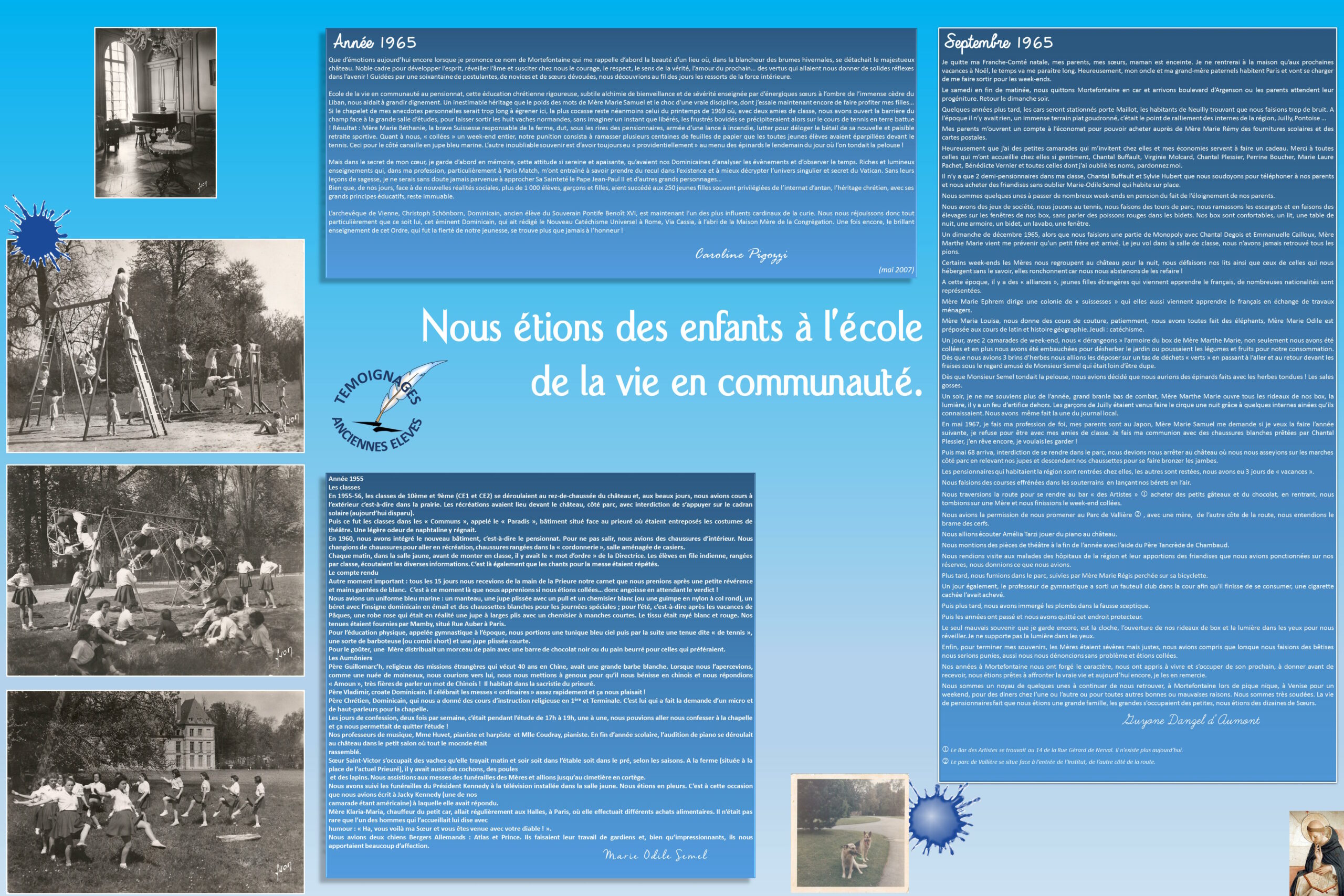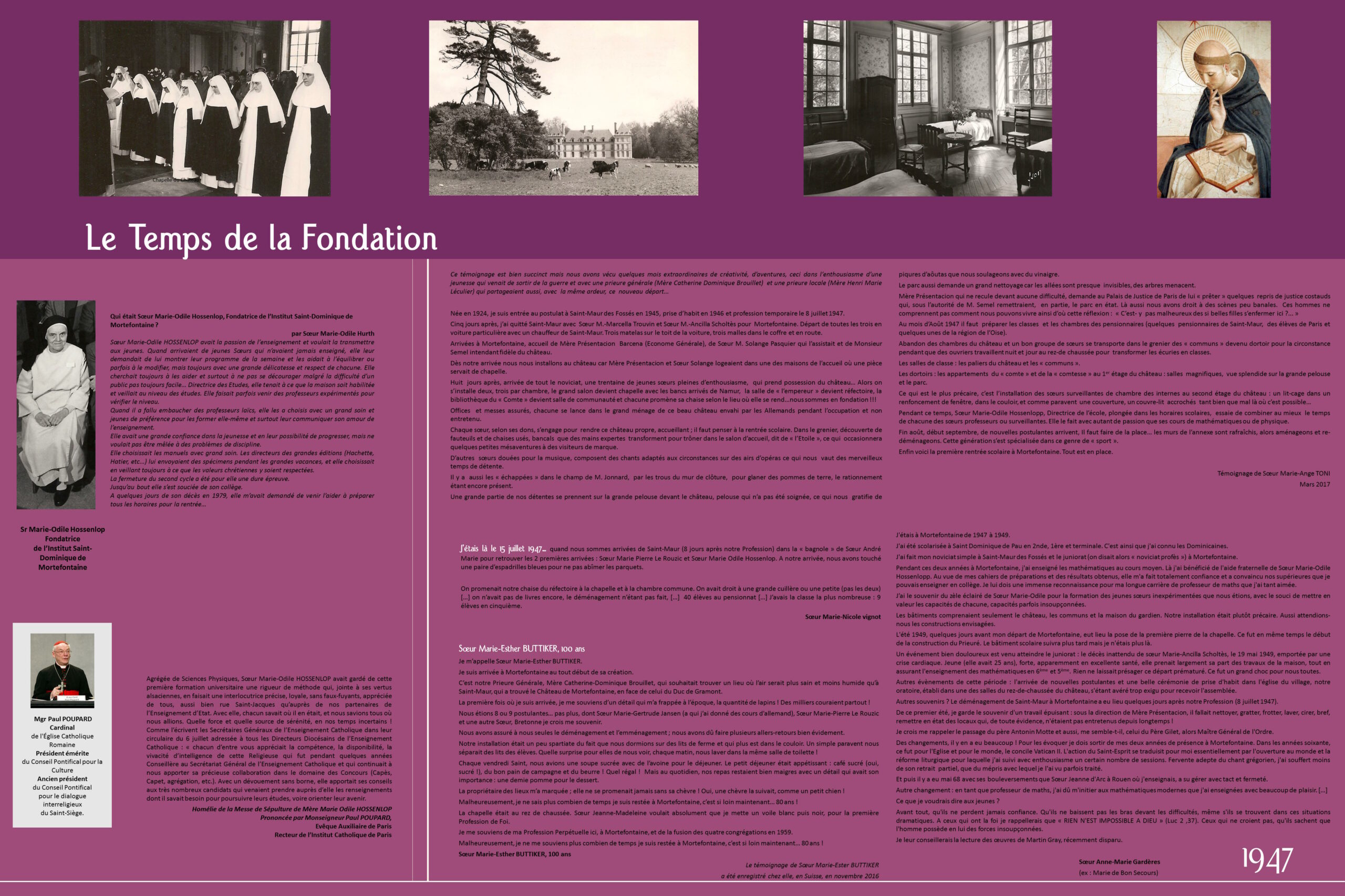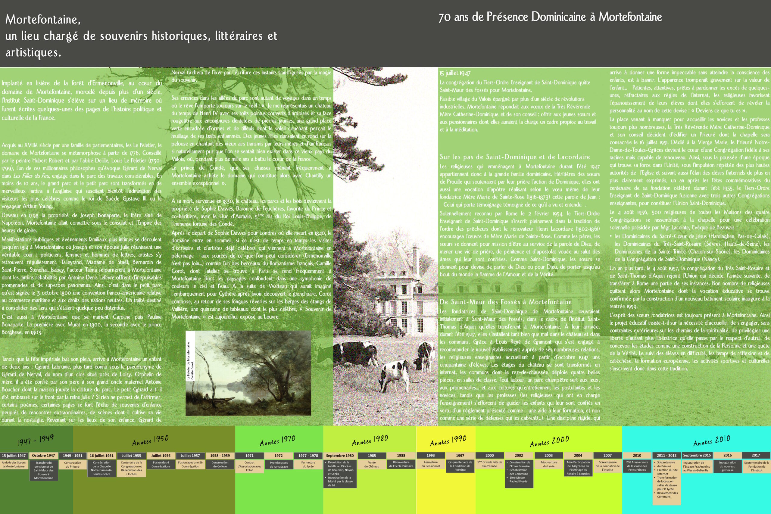 - 1947 : La Congrégation du Tiers-Ordre Enseignant de Saint-Dominique quitte Saint-Maur des Fossés pour Mortefontaine. Paisible village du valois épargné par plus d’un siècle de Révolutions Industrielles successives, Mortefontaine répondait aux voeux de la très Révérende Mère Catherine-Dominique et de son conseil : offrir aux jeunes sœurs et aux pensionnaires dont elles auraient la charge un cadre propice au travail et à la médiation.