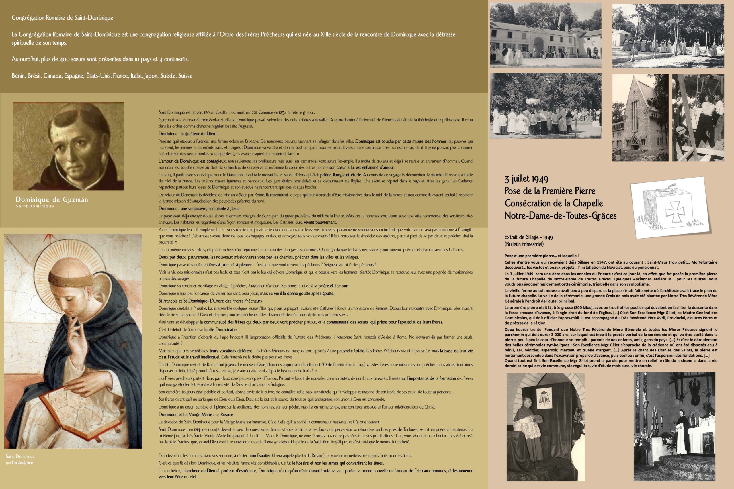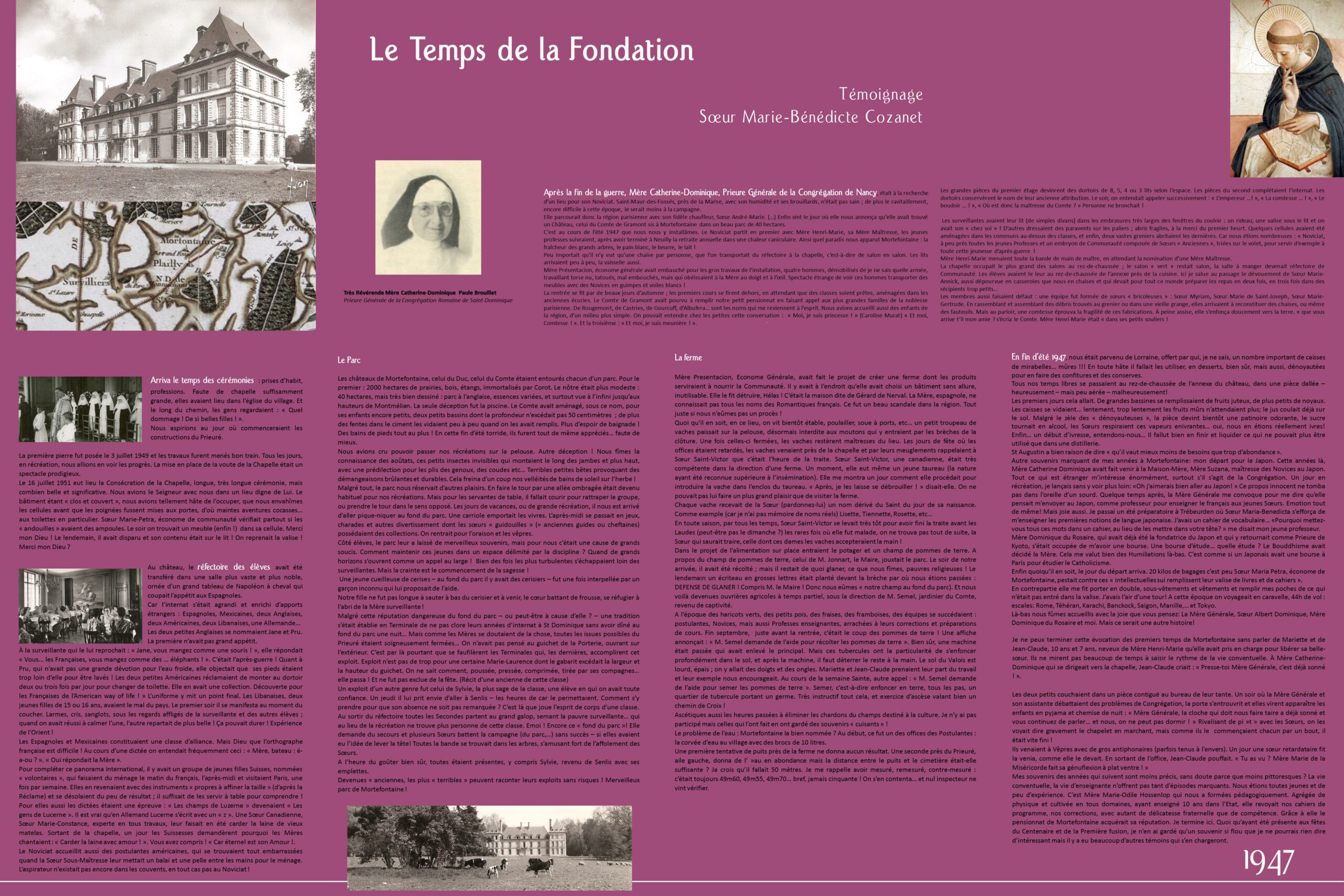 - 1951 : Consécration du Prieuré Notre-Dame-de-Toutes-Grâces, la place venant à manquer dans le château et les communs. Dédié à la vierge Marie, le Prieuré Notre-Dame-de-Toutes-Grâces devient le cœur d’une congrégation fidèle à ses racines mais capable de renouveau.